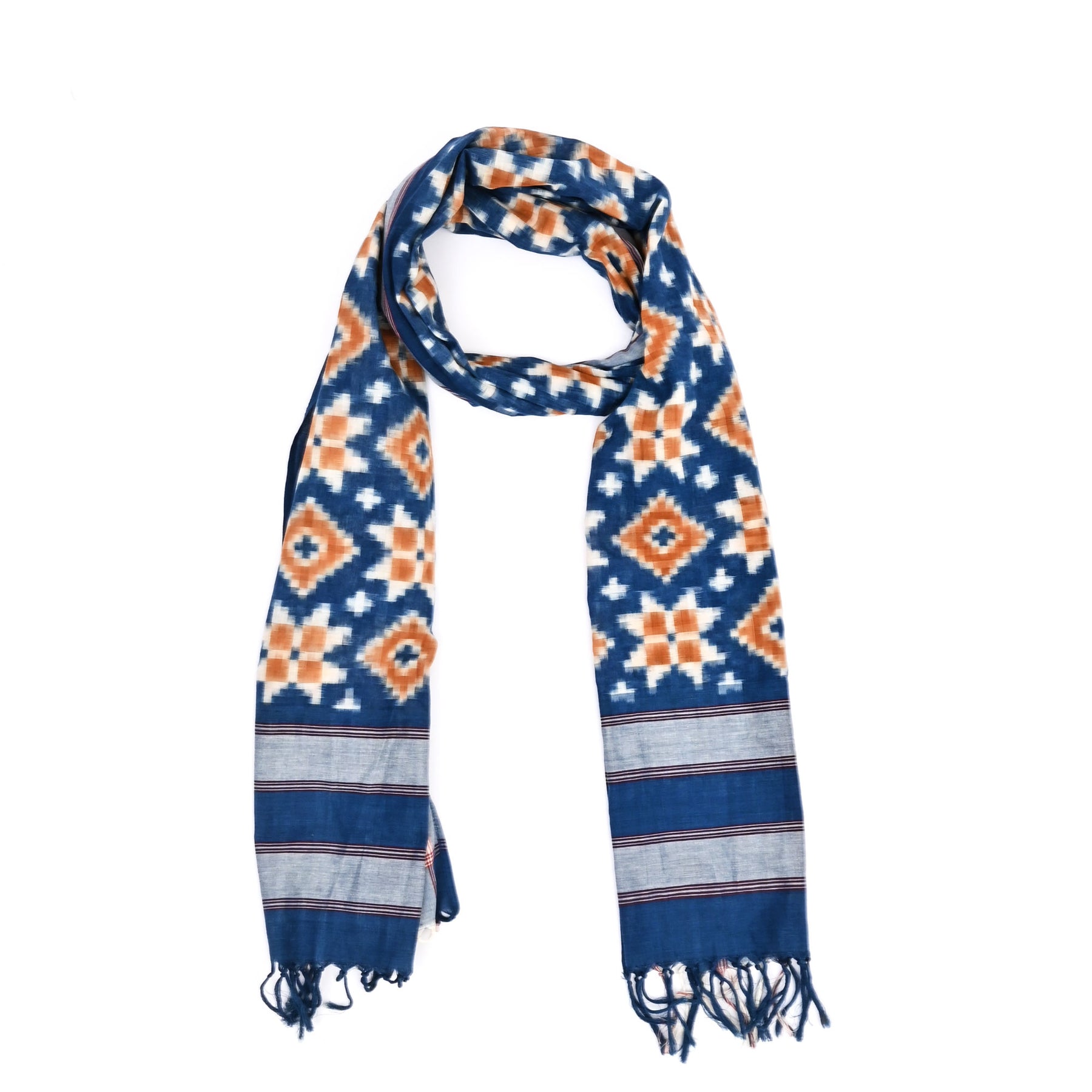 This gorgeous handwoven stole is perfect for anyone who loves unique, high-quality accessories. Made from soft, comfortable cotton, it measures 78" x 22" - the perfect size for many different styling options. The stole features beautiful geometric diamond and cross patterns in rich blue and warm orange colors. These stunning designs are created using a special traditional technique called double ikat. The eye-catching patterns are framed by lighter blue borders with charming red stripes and classic check details. Elegant, twisted tassels at the ends add a lovely finishing touch that shows the careful handwork. This stole feels wonderfully soft and breathable, making it comfortable to wear while looking incredibly stylish. The natural dyes and traditional weaving methods make each piece special and unique. Perfect for adding a pop of color and artisan style to any outfit, this stole celebrates beautiful craftsmanship while being practical enough for everyday wear. It's a timeless piece that brings together comfort, beauty, and authentic handmade quality.