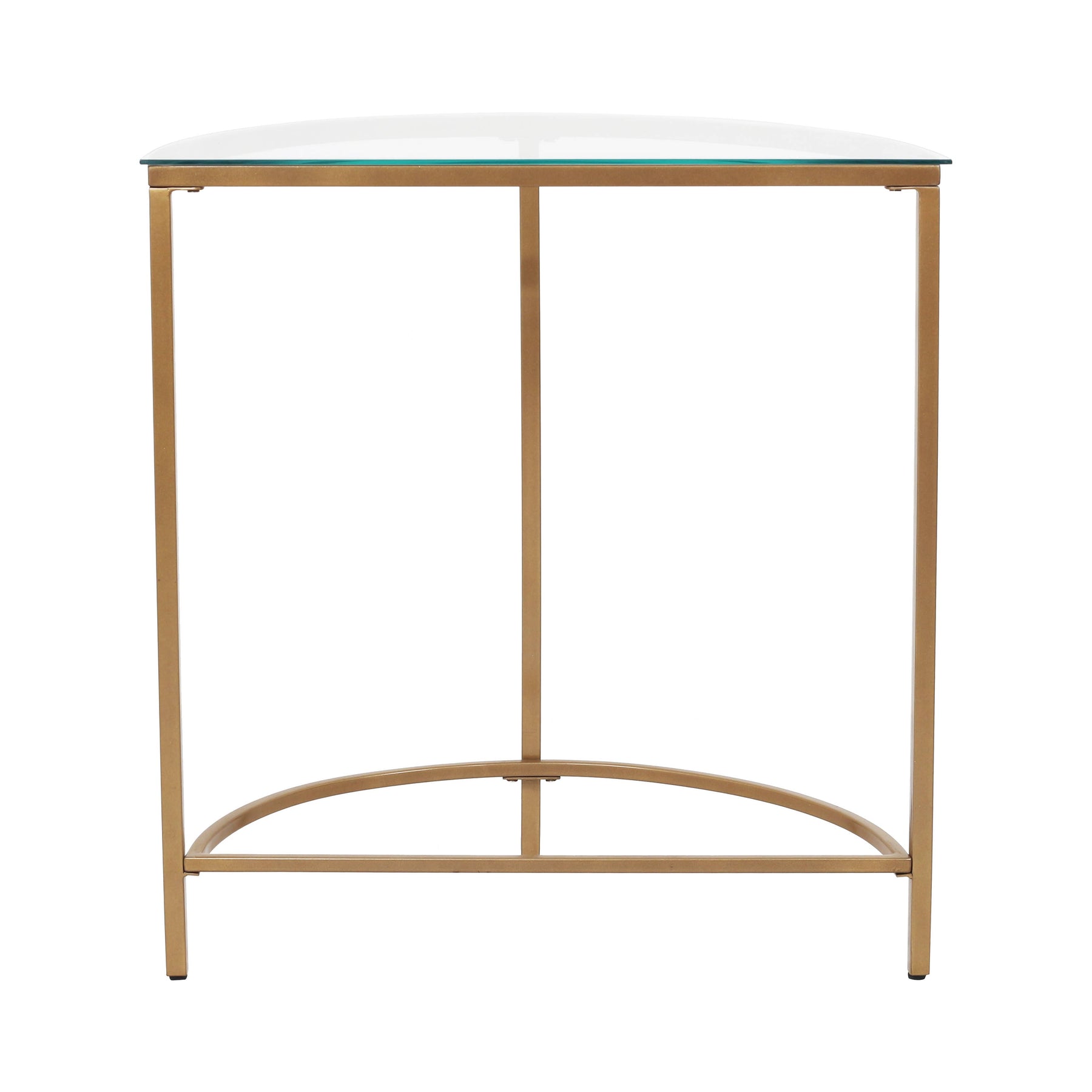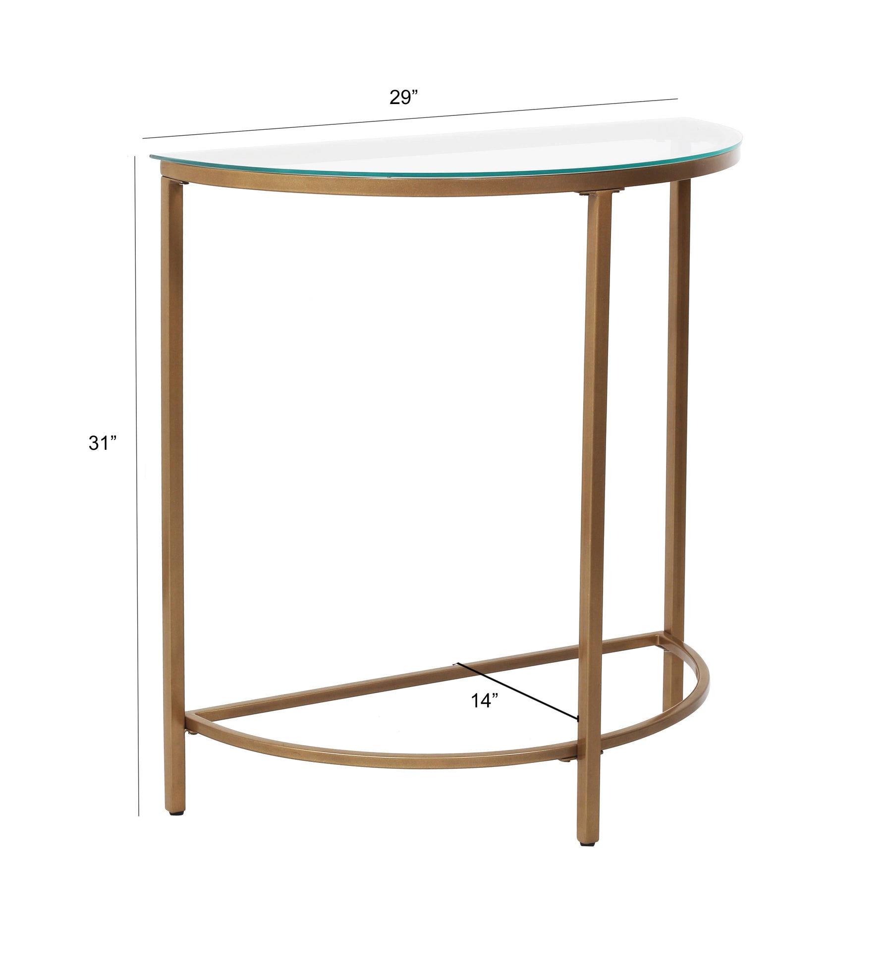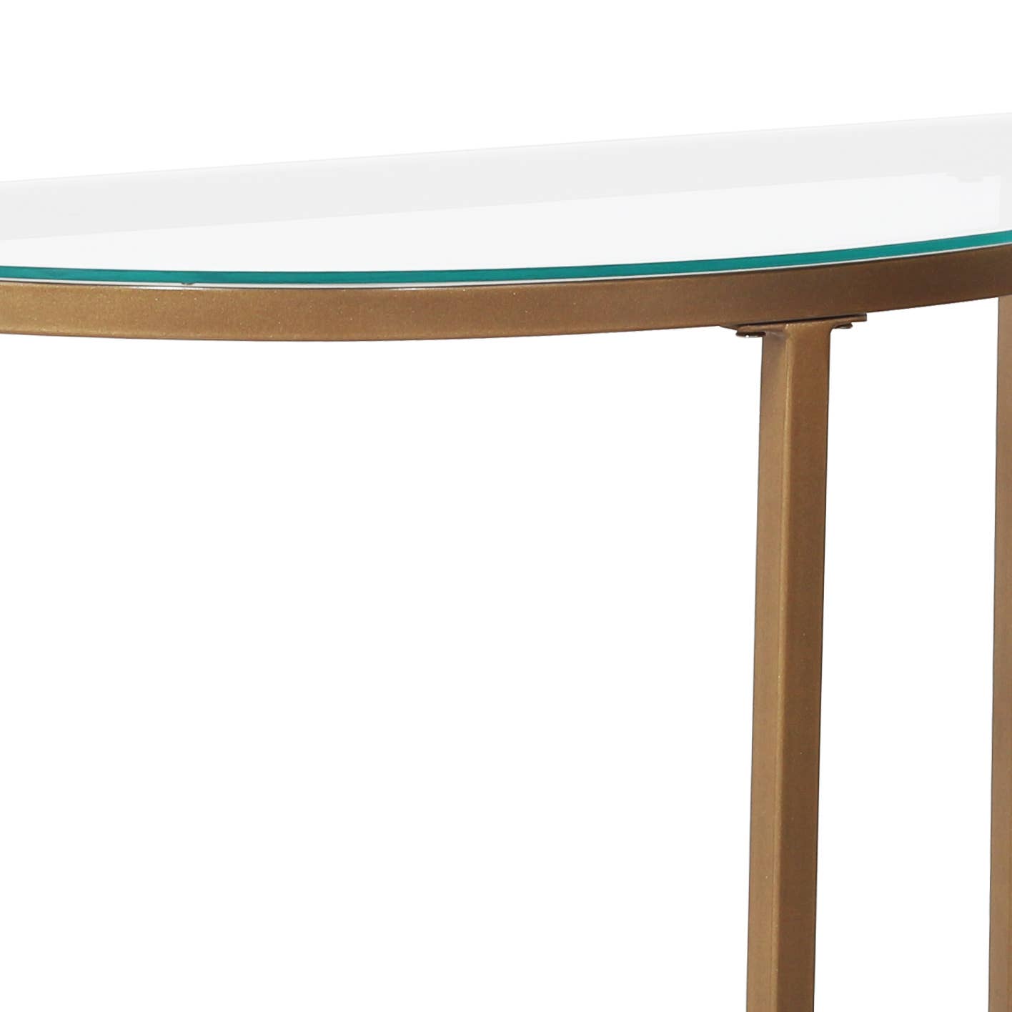 This striking D-Shaped Console Table brings elegance and modernity to any room with its sleek glass top and golden base. The glass top offers a clean, transparent surface that beautifully contrasts with the luxurious golden base, creating a high-end, sophisticated look. With product dimensions of 29" (L) x 14" (W) x 31" (H), this console table is perfect for entryways, hallways, or as an accent piece in living rooms and bedrooms.