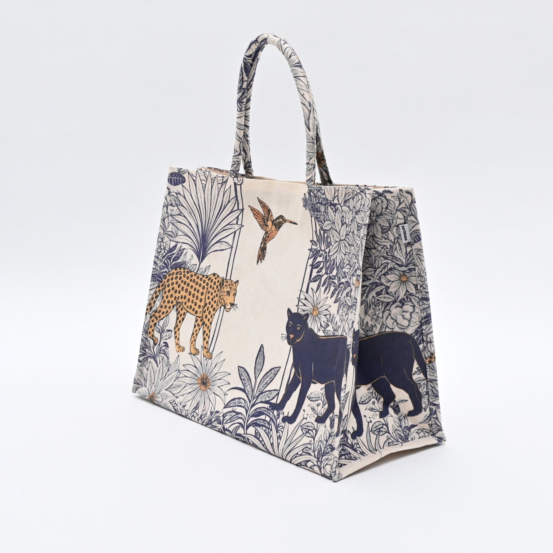 Panthera Blue Shopper Bag is artistic wildlife-printed canvas Shopper bag, featuring elegant illustrations of jungle animals.