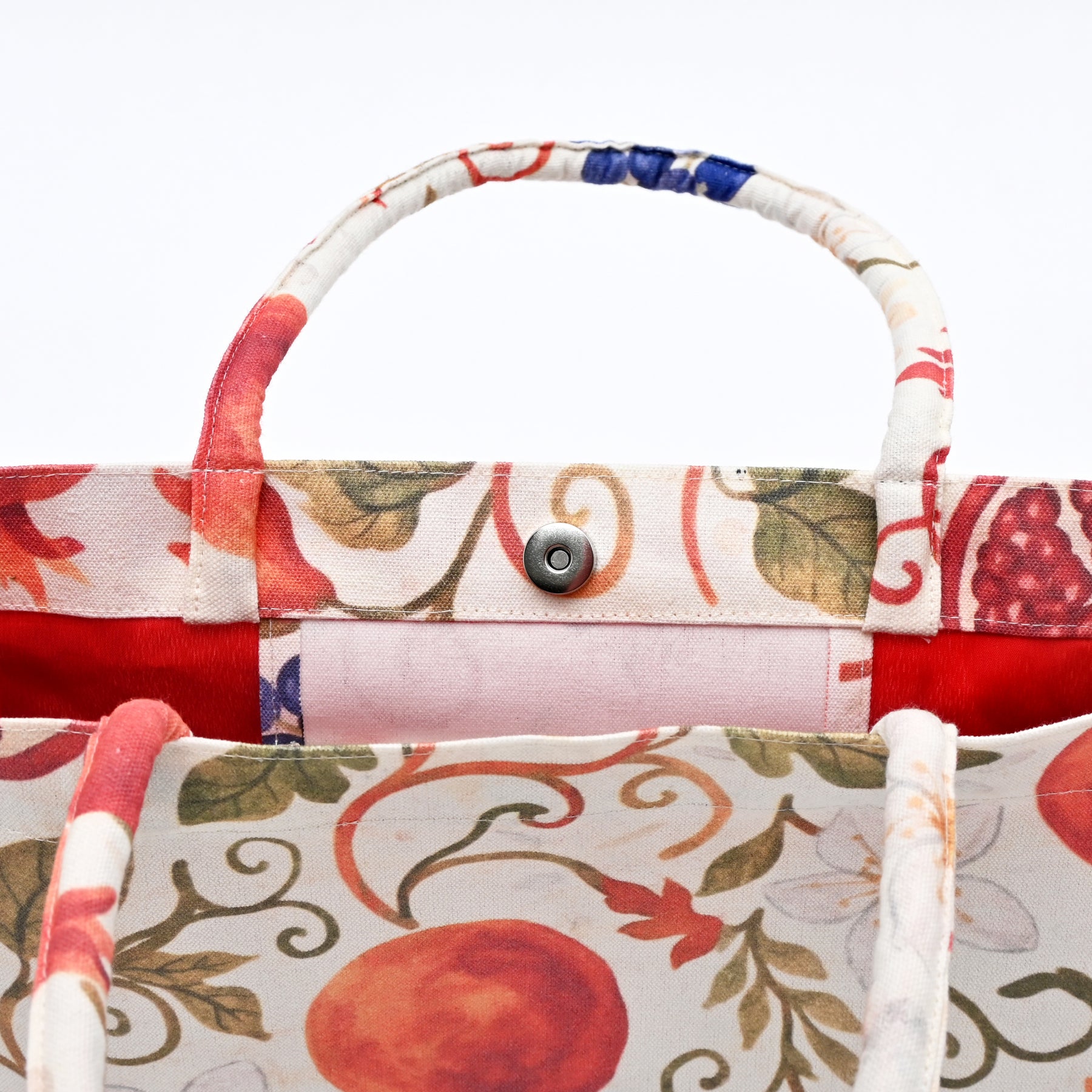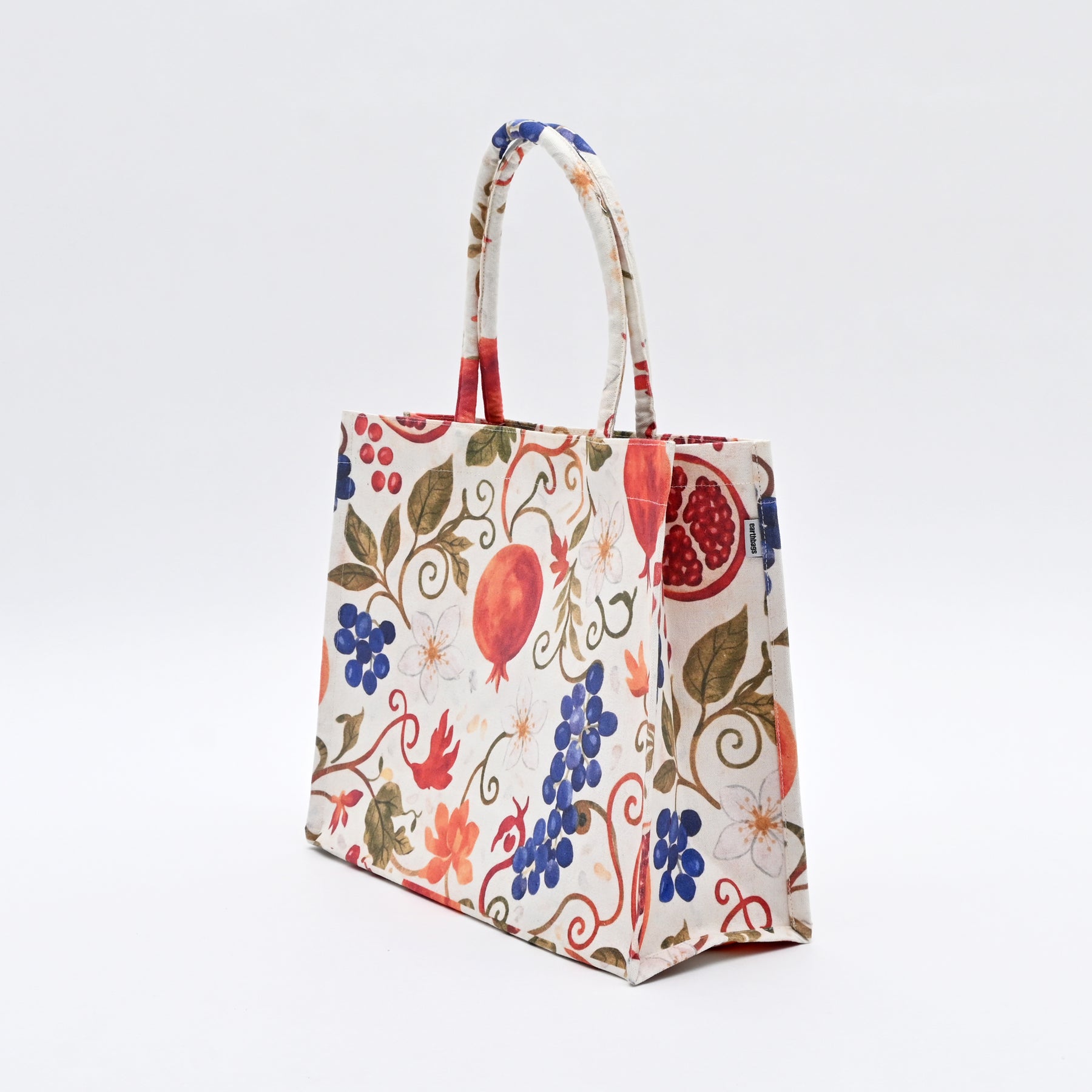 Tuscan Vine Carry Bag is a fruit-printed canvas Carry bag, featuring elegant motifs of pomegranates, grapes,.