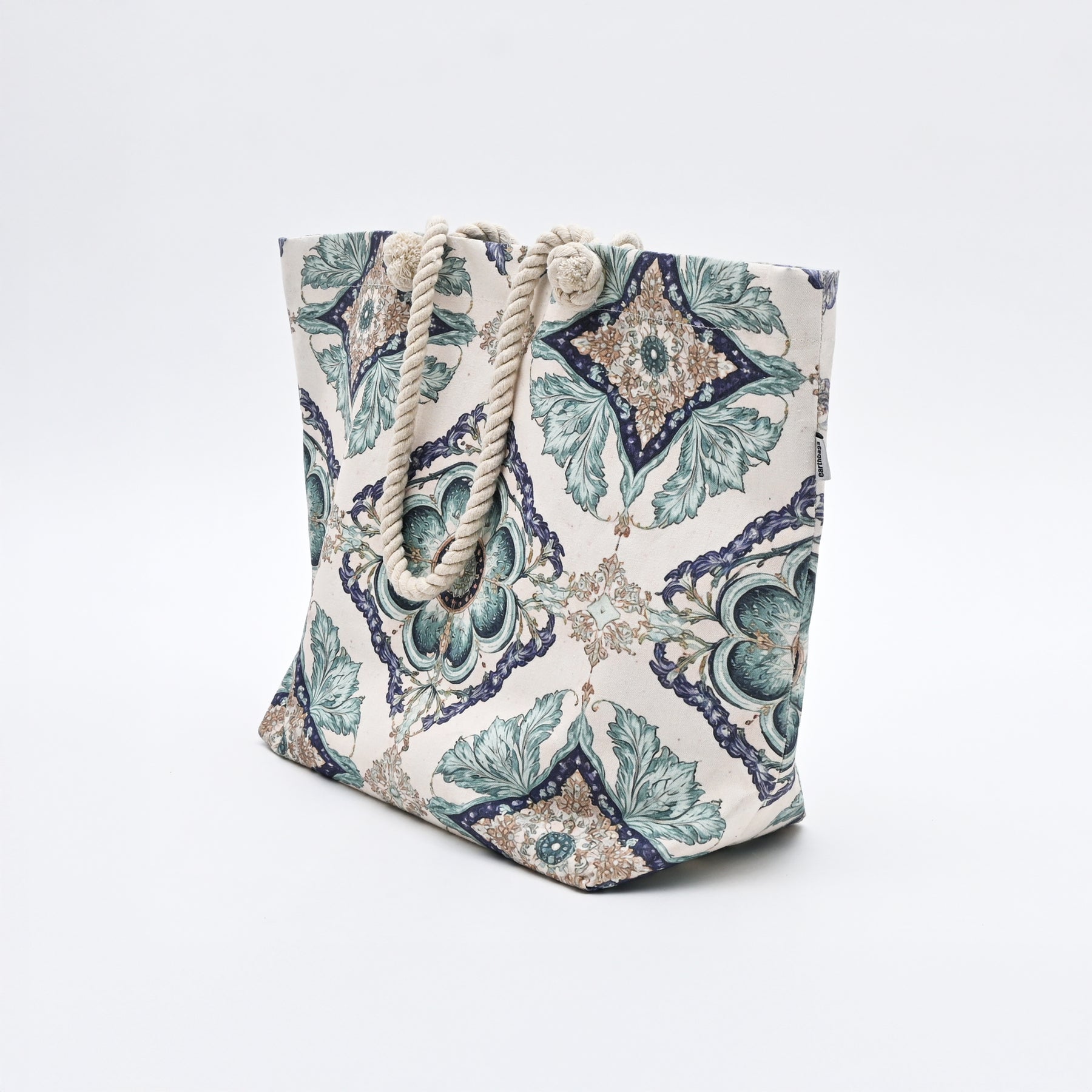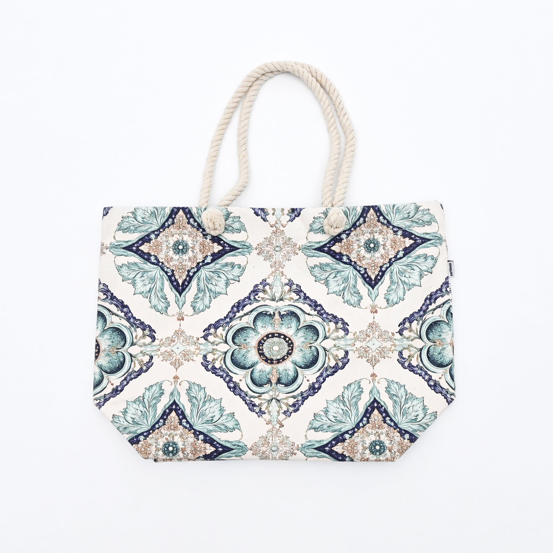 Azure Tile Tote Bag is a printed canvas Carry bag, designed with a sophisticated ornamental pattern in soothing pastel tones. Crafted from premium-quality, durable canvas, this tote offers both strength and a refined look. The thick padded canvas handles provide a comfortable grip and enhance durability for regular use. Spacious and lightweight, it easily accommodates daily essentials, shopping items, books, or travel must-haves. Reusable and eco-friendly, it serves as a stylish alternative to plastic bags. Perfect for shopping, work, casual outings, travel, or weekend use, this tote blends practicality with timeless design.