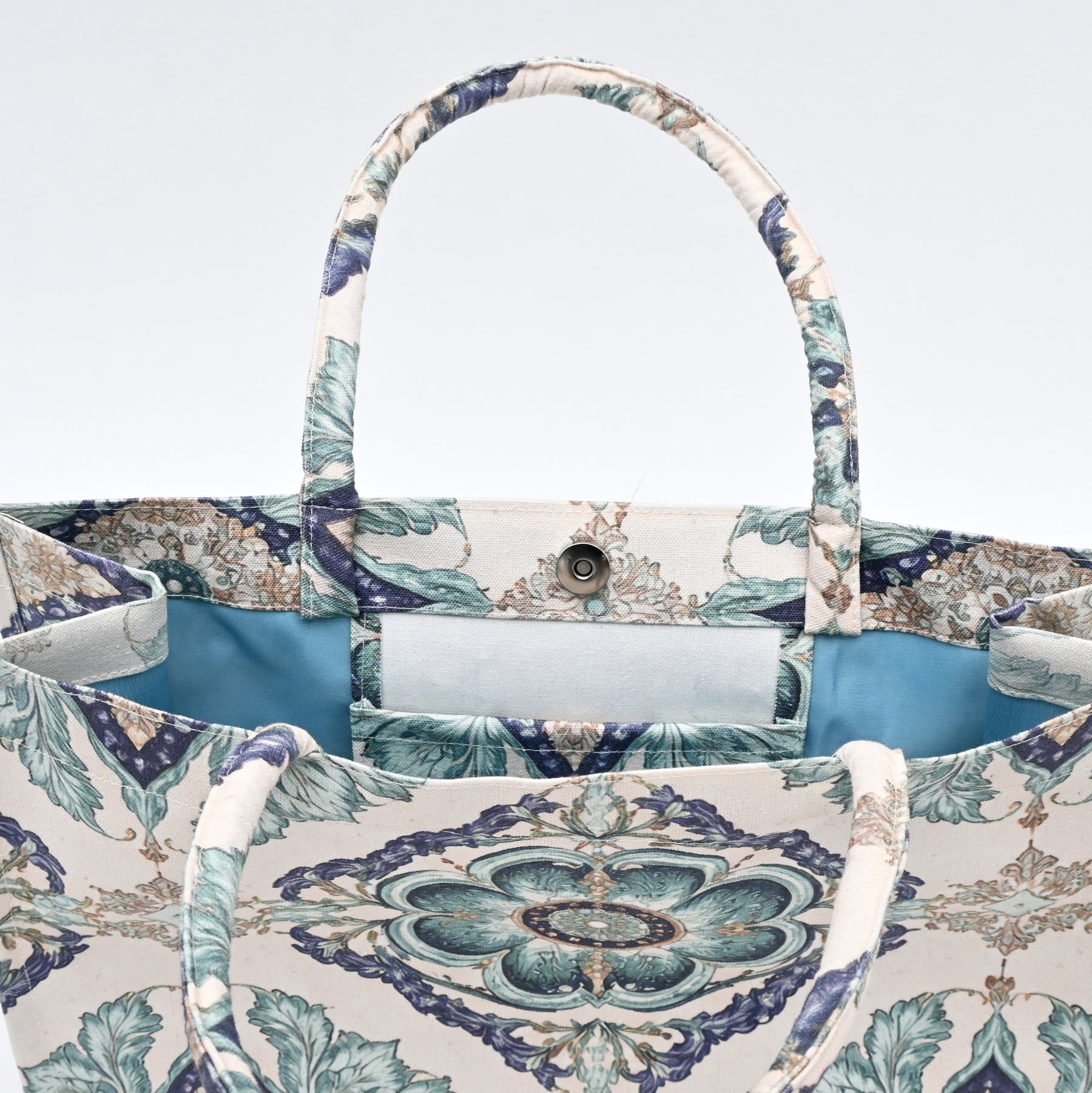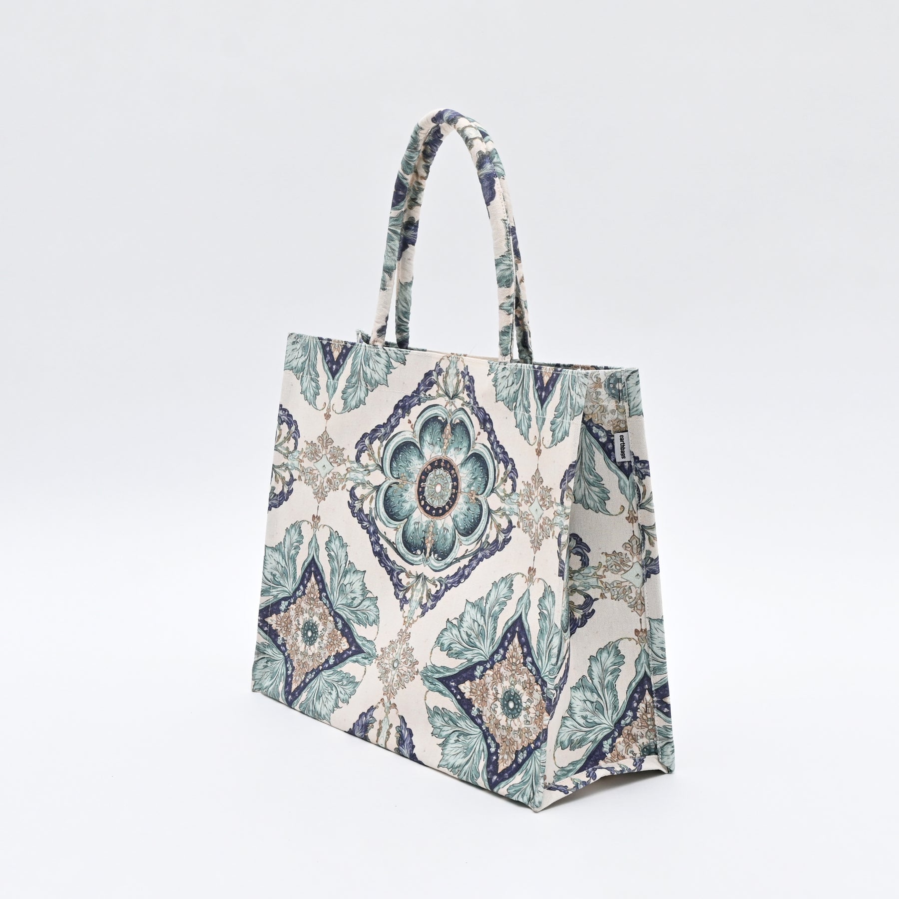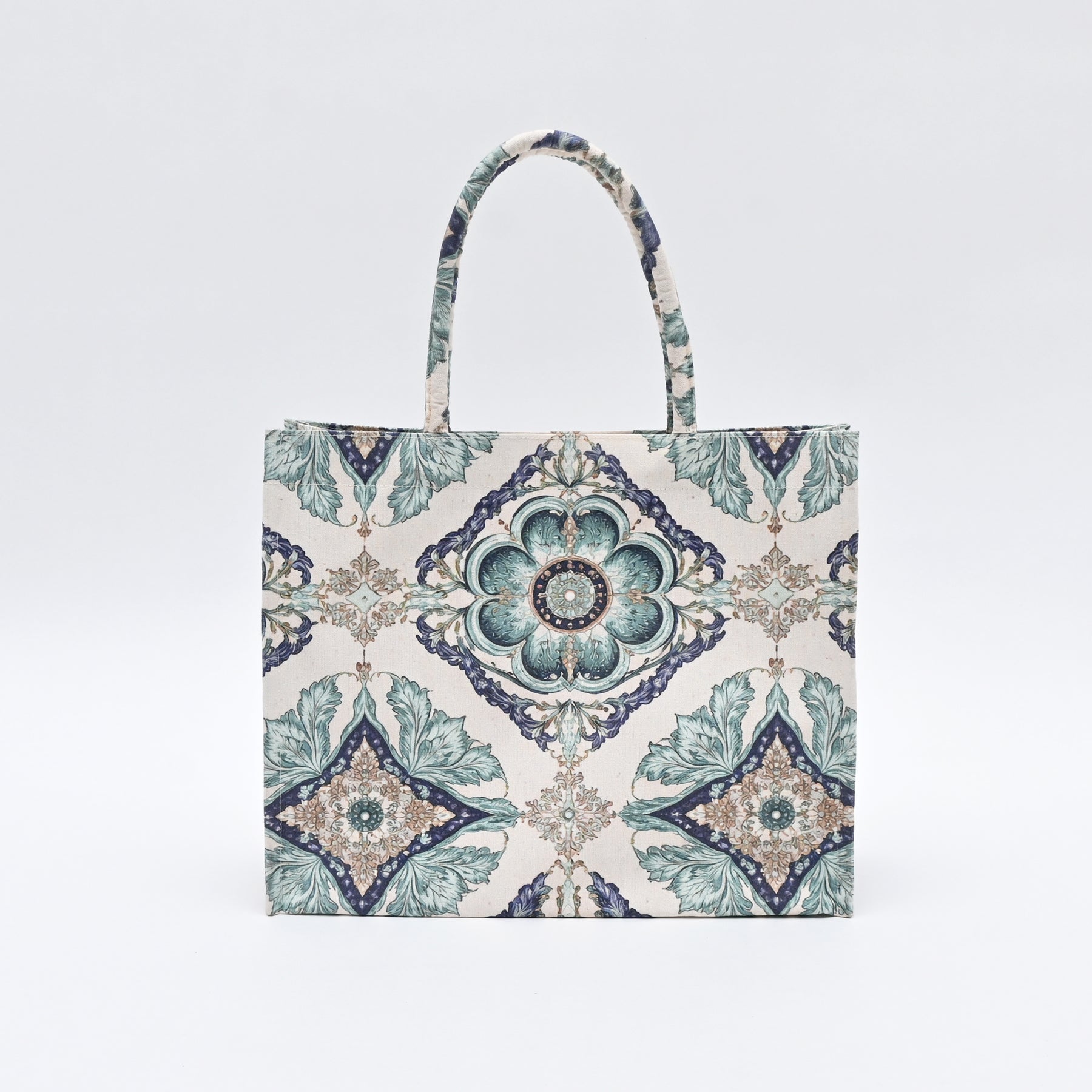 Azure Tile Tote Bag is a printed canvas Shopper bag, designed with a sophisticated ornamental pattern in soothing pastel tones. Crafted from premium-quality, durable canvas, this tote offers both strength and a refined look. The thick padded canvas handles provide a comfortable grip and enhance durability for regular use. Spacious and lightweight, it easily accommodates daily essentials, shopping items, books, or travel must-haves. Reusable and eco-friendly, it serves as a stylish alternative to plastic bags. Perfect for shopping, work, casual outings, travel, or weekend use, this tote blends practicality with timeless design.