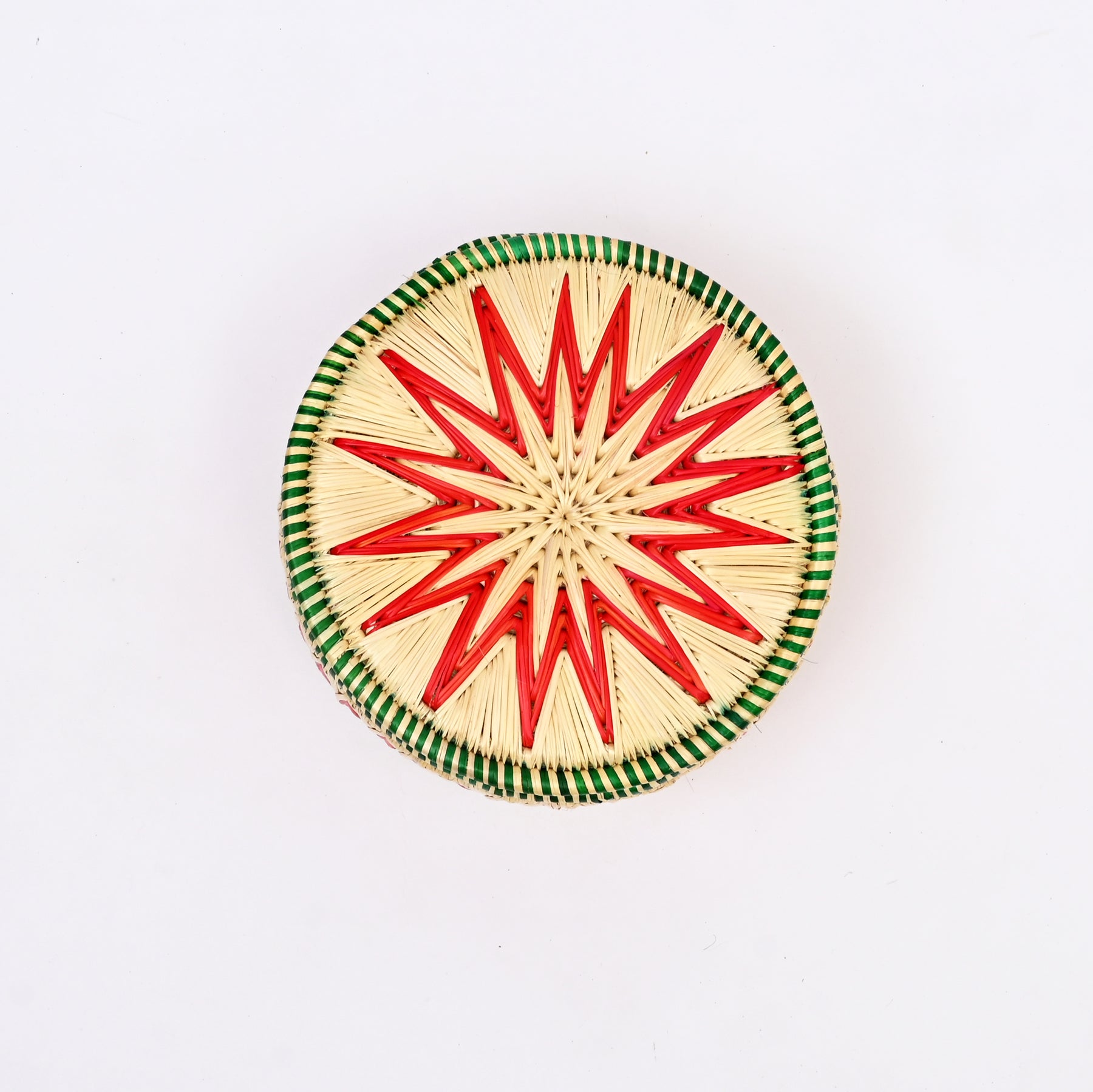 - Stunning Sunburst Design: Natural golden base with vibrant red & green woven accents.