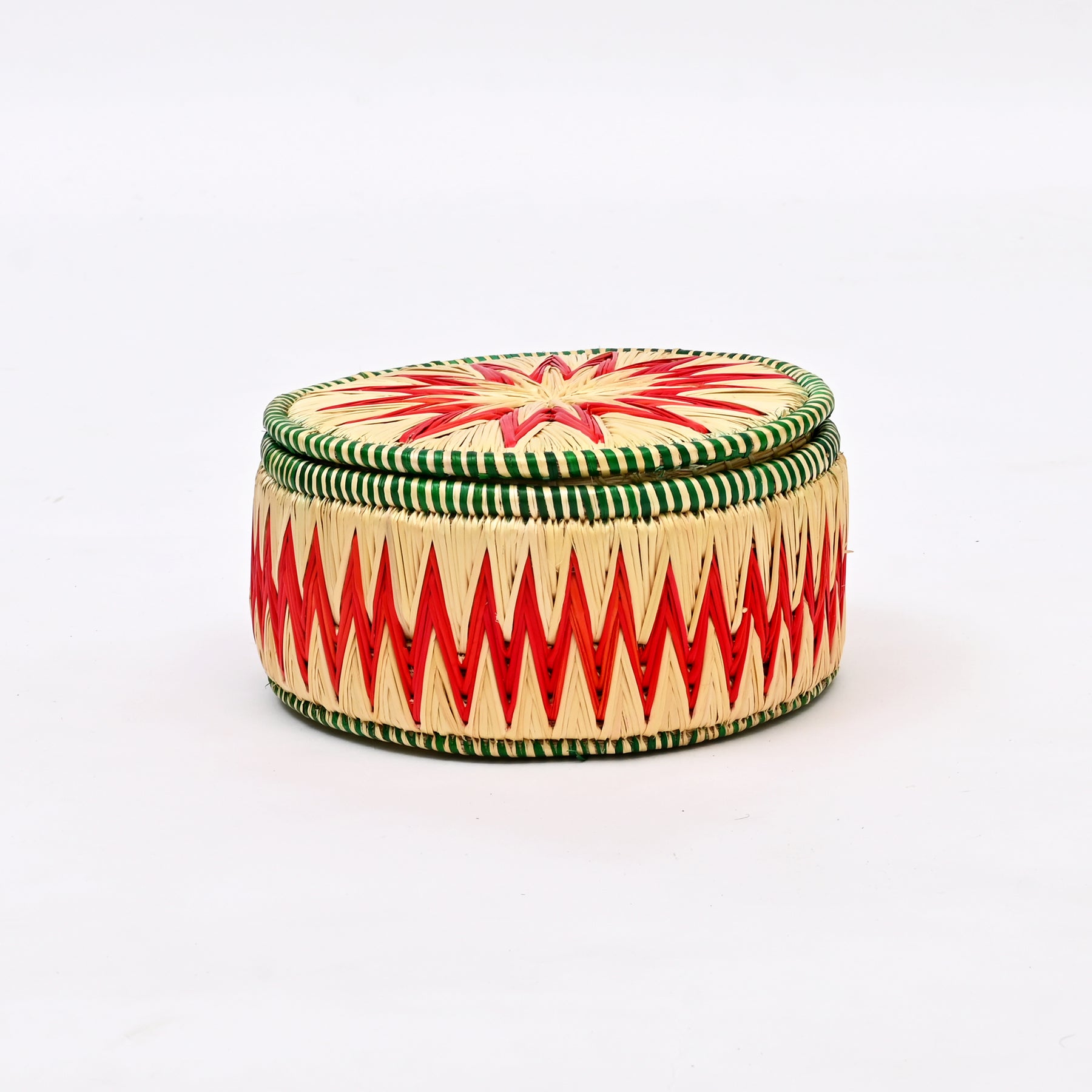 Transform your kitchen with this stunning handcrafted sikki grass roti box featuring an eye-catching sunburst design in natural golden yellow with vibrant red and green accents. Measuring 8" x 7.8", this traditional storage solution brings authentic Indian artistry to modern dining. Expertly handwoven by skilled Bihar artisans using 100% natural sikki grass, this versatile box traditionally stores rotis and chapatis while maintaining freshness. The snug-fitting lid with striking sunburst pattern creates beautiful tabletop display when not in use. Perfect for eco-conscious households seeking sustainable kitchen storage or unique serving pieces. Beyond bread storage, use it for snacks, dry fruits, or as decorative accent piece. The lightweight yet sturdy construction ensures durability while supporting rural livelihoods. Experience the beauty of centuries-old craft tradition while embracing environmentally responsible living with this biodegradable kitchen essential.