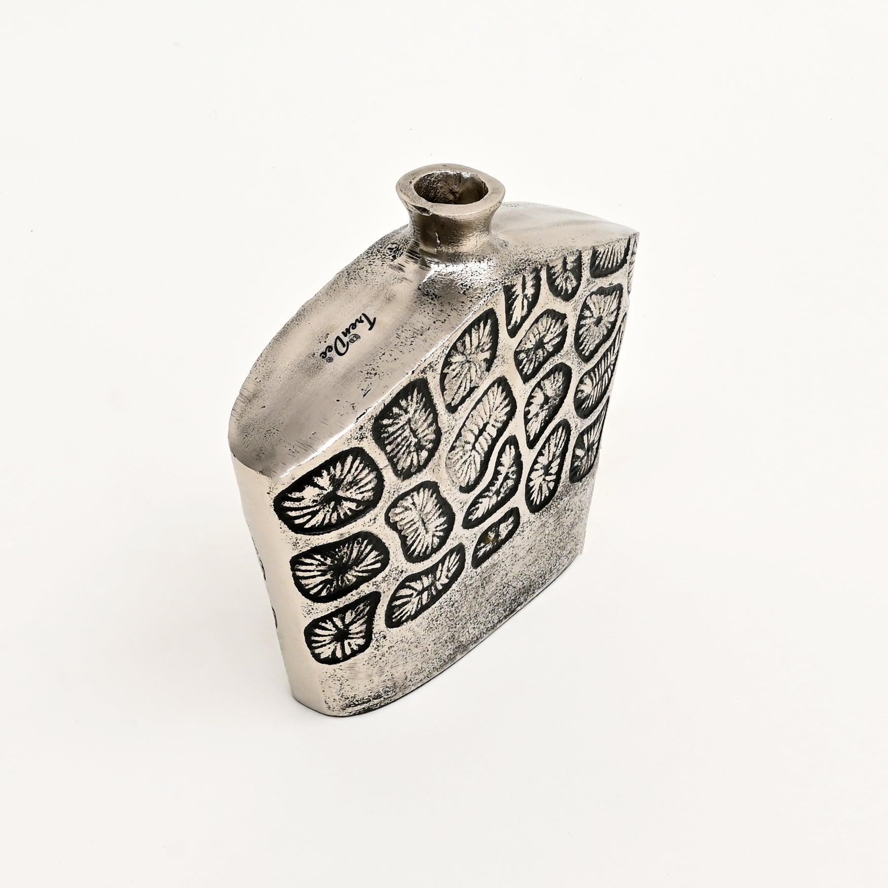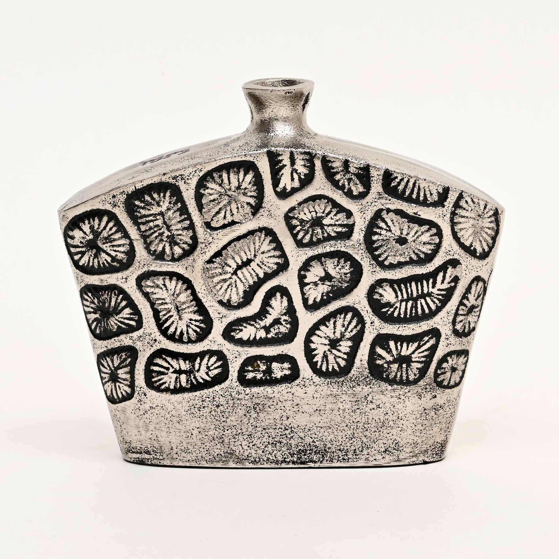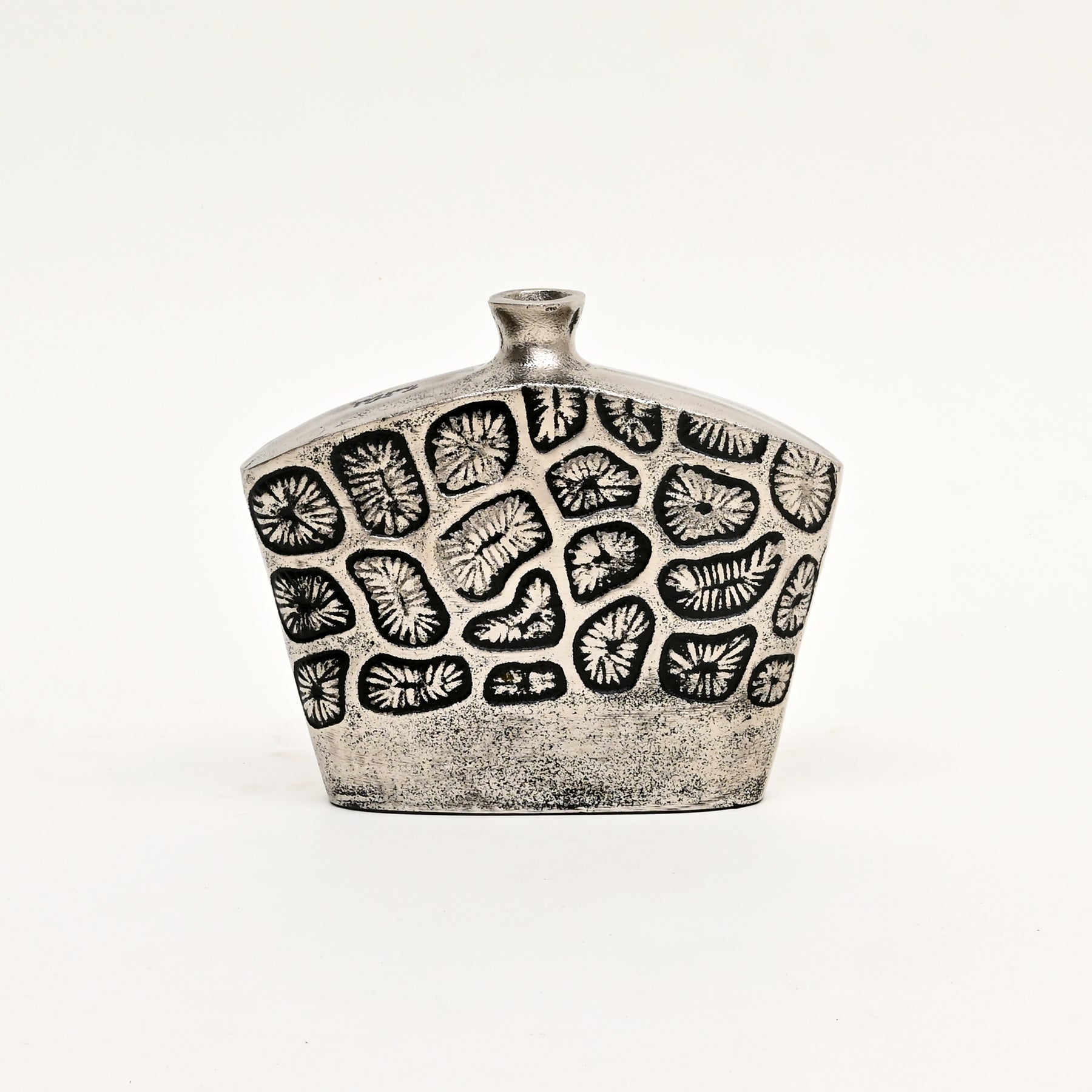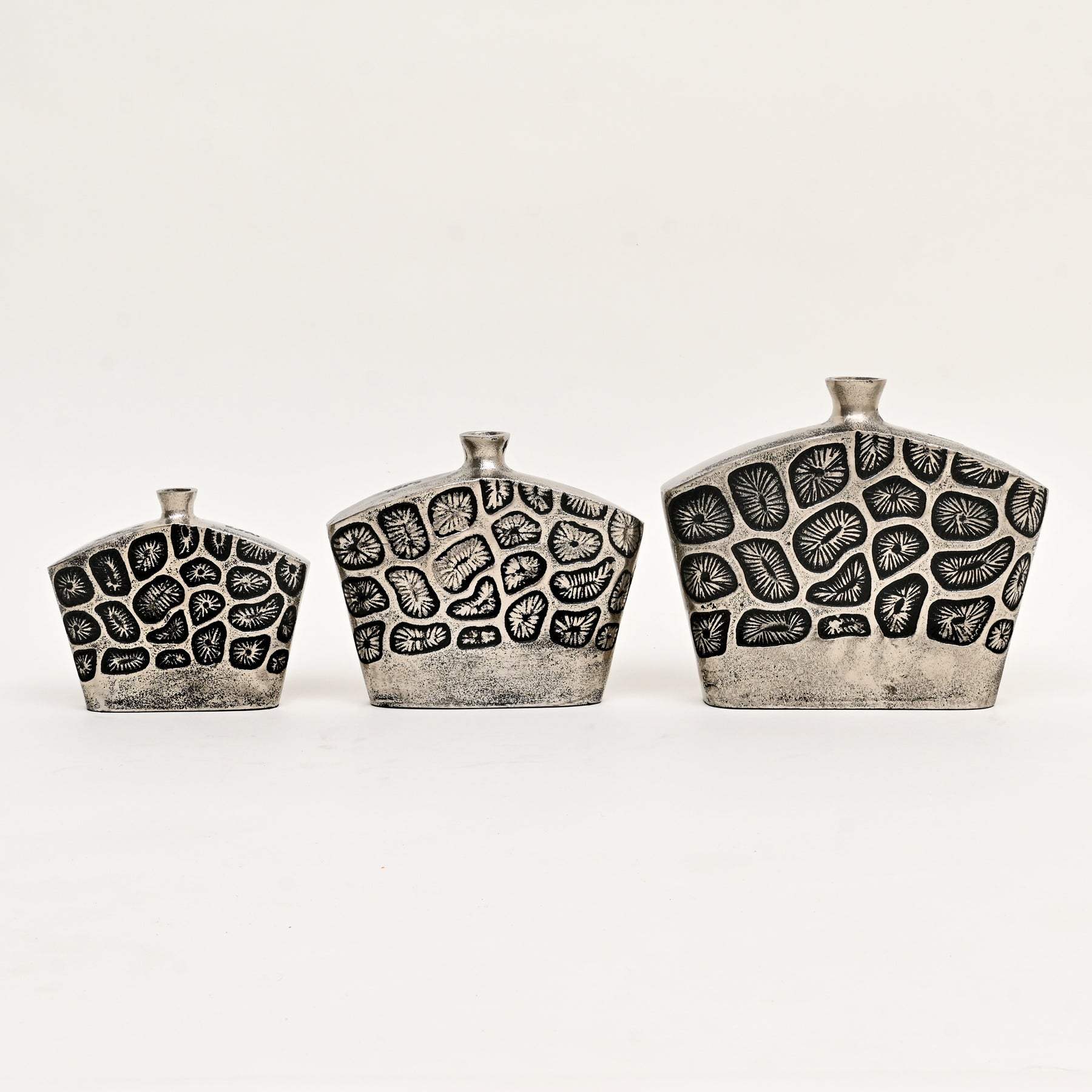 Make a bold statement with the Decorative Modern Geometric Fusion Vase Set, a trio of sculptural vases that blend industrial charm with sleek contemporary design. Crafted from durable aluminum, these vases feature unique geometric shapes finished in a sophisticated combination of nickel polish and black antique effects. Varying in size and shape, they offer dimensional layering that enhances any surface—whether styled alone or with dried botanicals. This set brings texture, contrast, and a modern artistic edge to tabletops, consoles, and shelving.