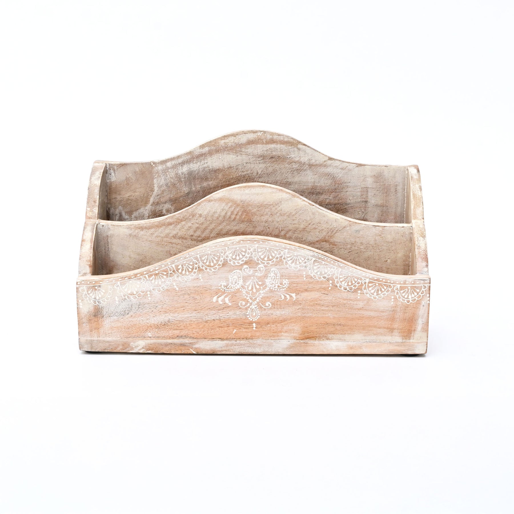 Inspired by fluid, wave-like forms, this white wash desk organiser brings both function and artistic charm to your workspace. Crafted from solid mango wood, it features softly curved dividers that create multiple compartments while adding visual movement. The white-washed exterior paired with natural wood interiors offers a warm, modern contrast, making it a stylish solution for organizing documents, stationery, or everyday desk essentials.