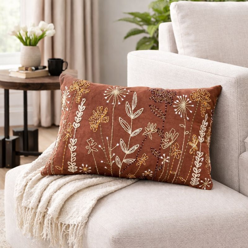 Add warm rustic charm to your décor with this Linen Embroidered Lumbar Pillow (16 x 24"), beautifully handcrafted with delicate nature-inspired embroidery. Made from premium linen fabric, it offers a breathable, textured feel with lasting durability. The earthy tones and floral detailing create a cozy, elegant look that works perfectly for seasonal styling or year-round décor. Ideal for sofas, beds, armchairs, or reading nooks, this lumbar cushion brings both comfort and visual sophistication to any space. A timeless accent piece and a thoughtful gifting option for home décor lovers.