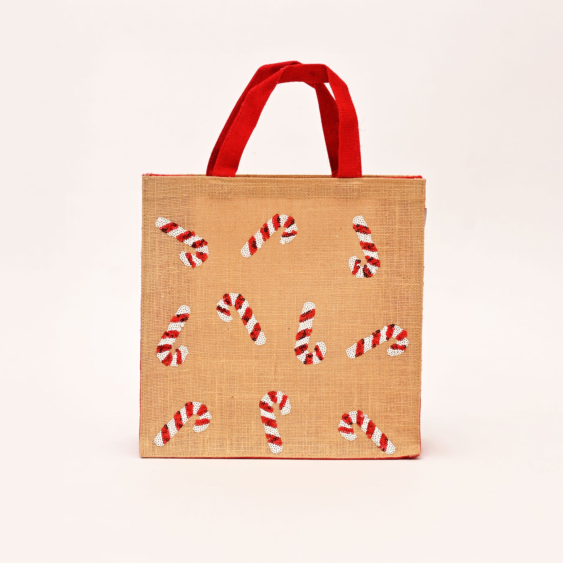 Festive Sequin Design: Natural laminated jute bag accented with red panels and sparkling sequin candy cane motifs, perfect for Christmas and festive use.