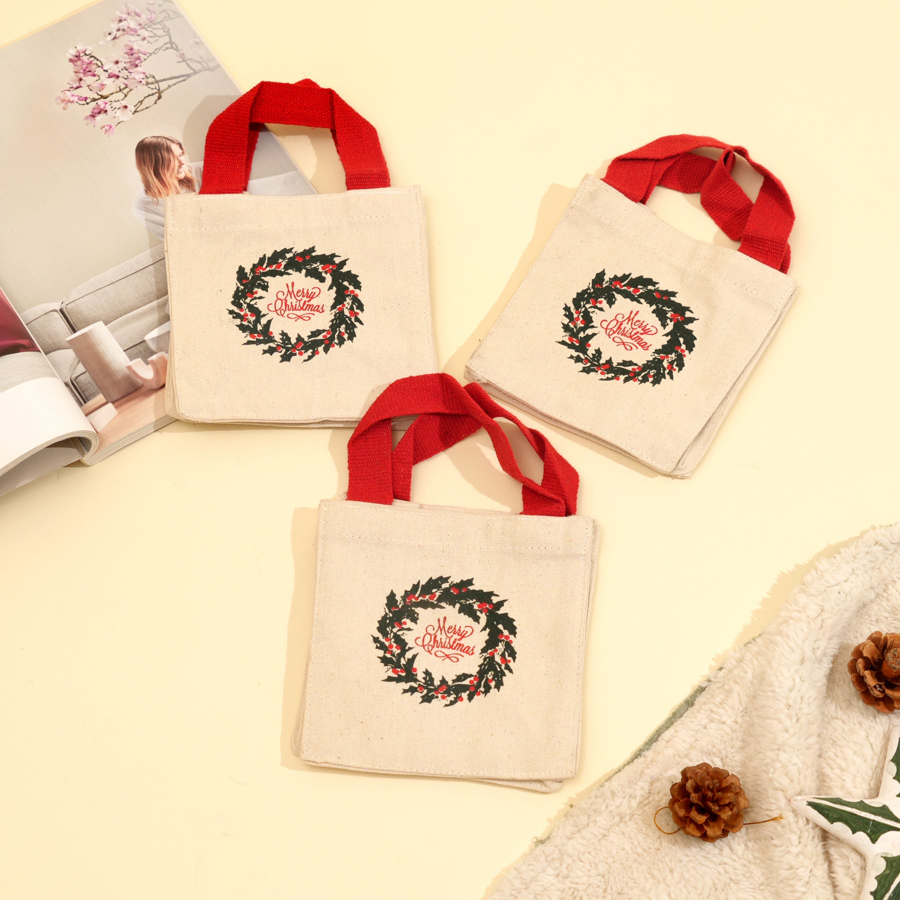 Designed with dyed thick flat webbing handles, these bags offer enhanced strength and comfortable carrying. The compact size makes them perfect for small gifts, treats, party favors, and festive goodies. Eco-friendly and reusable, these canvas bags are an excellent sustainable alternative to disposable gift wrapping, ideal for Christmas and festive celebrations.