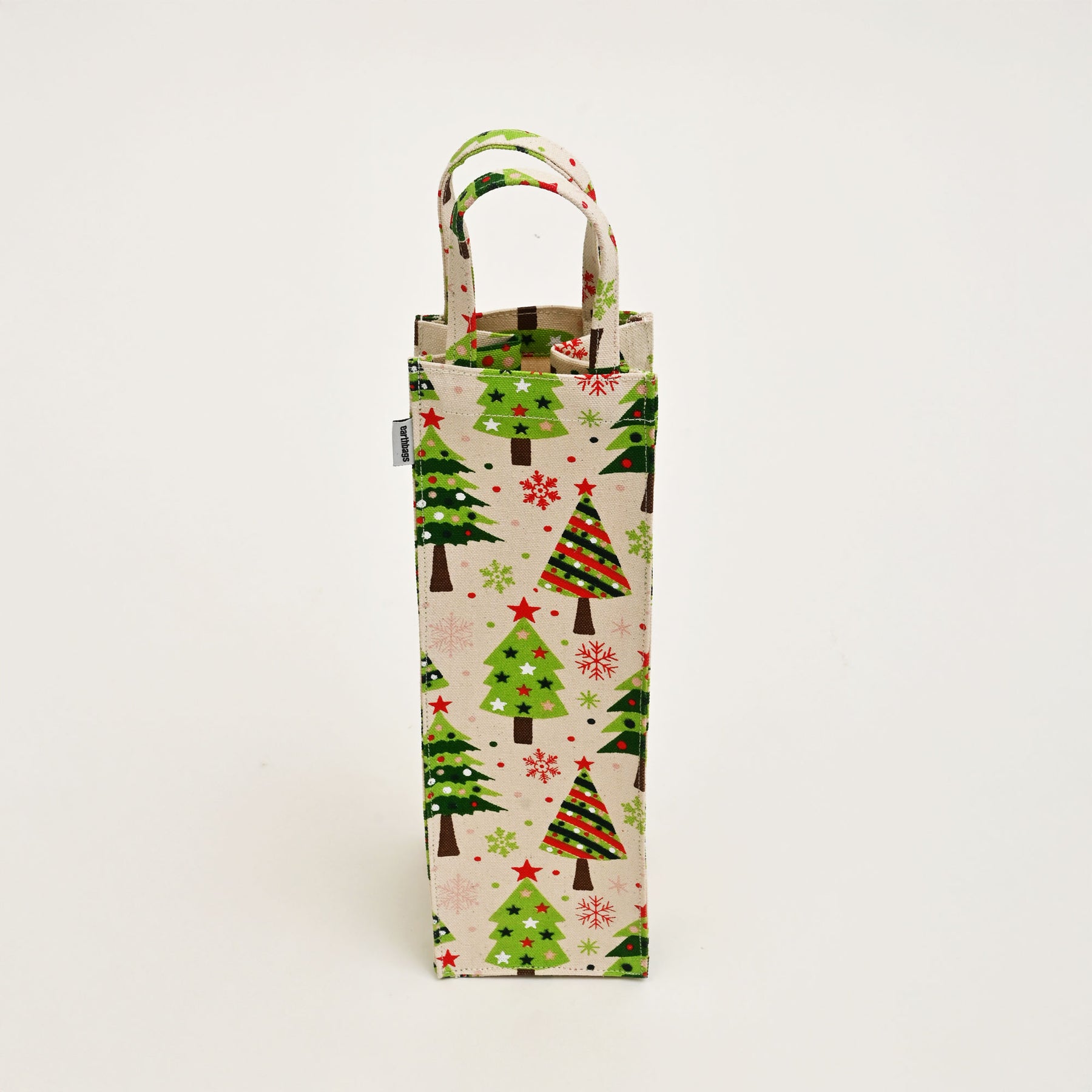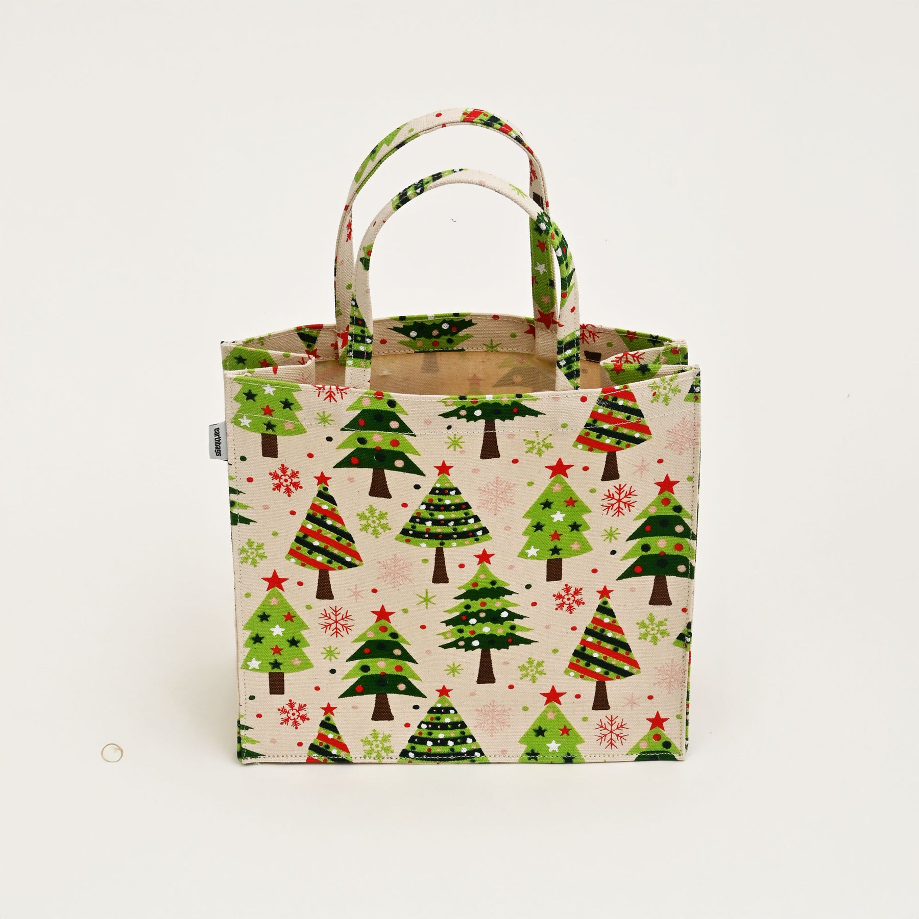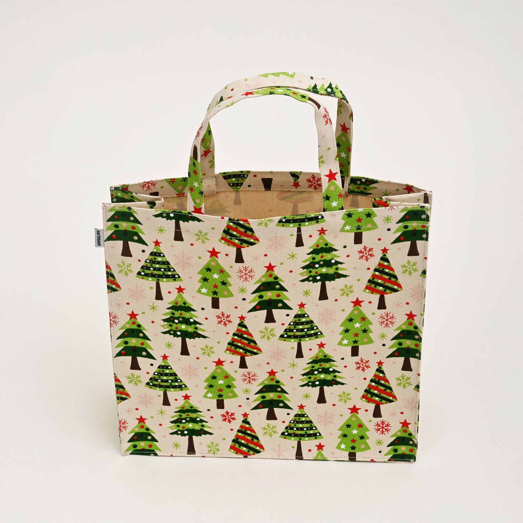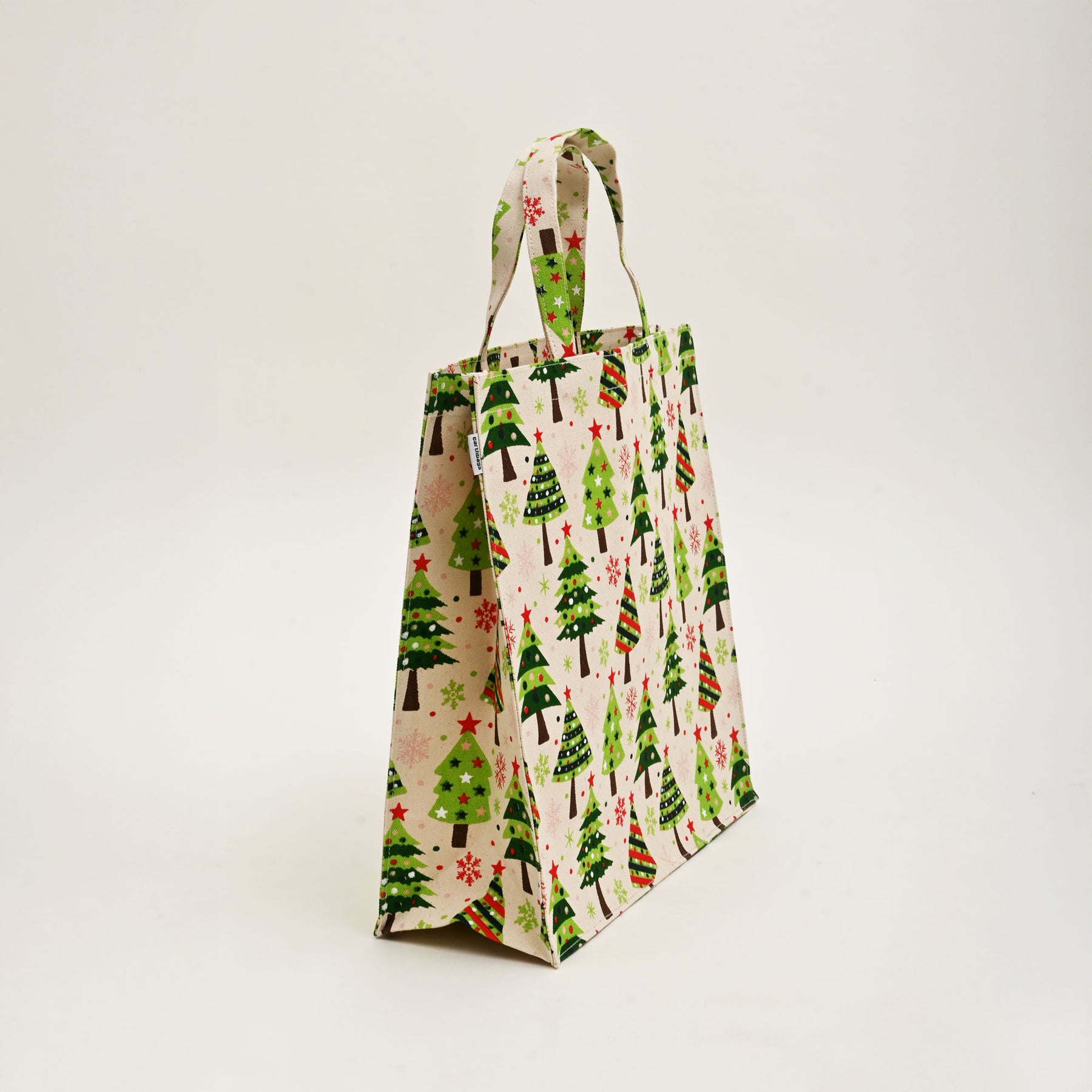 Festive All-Over Print: Laminated cotton canvas bag with vibrant Christmas tree print, perfect for holiday gifting.