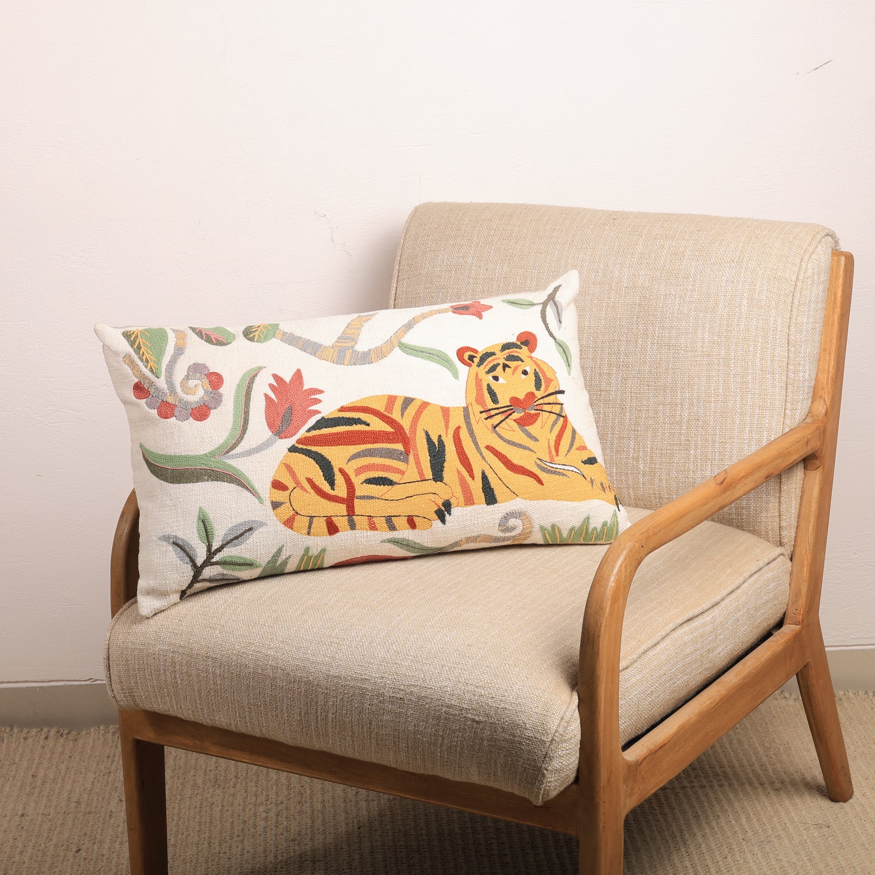 The Floral Safari Tiger Pillow features a charming tiger illustration surrounded by vibrant floral patterns, set against a white cotton fabric. The playful and bold design adds a touch of nature-inspired beauty to your home, making it a perfect statement piece for any space. Ideal for adding comfort and personality to your living room, bedroom, or even as an accent on your outdoor seating.
