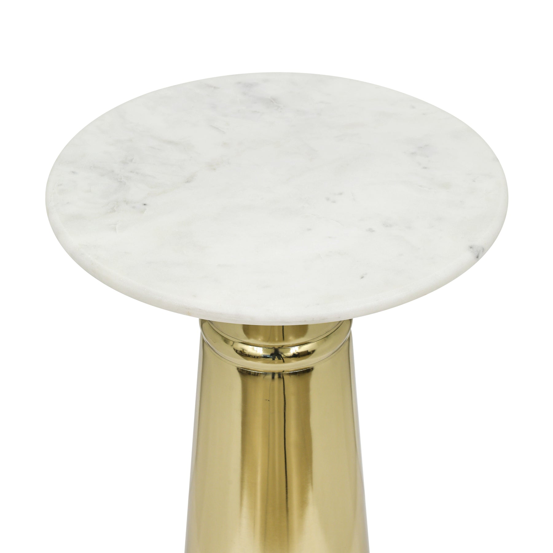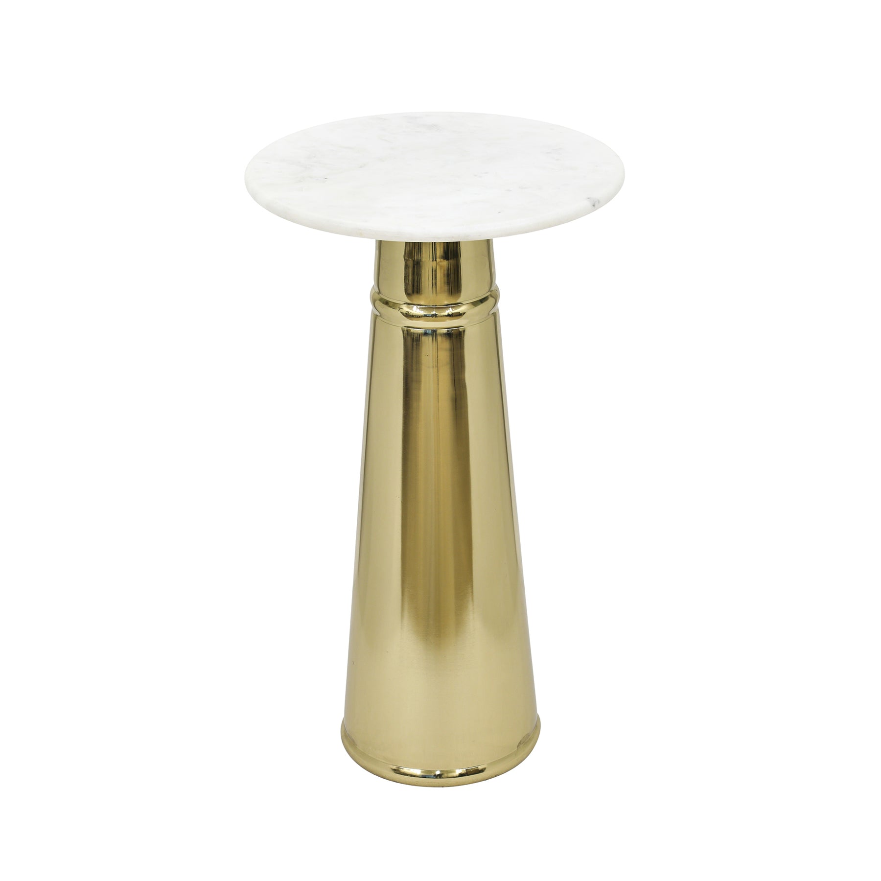 The Side Table with Natural White Marble Top features a sophisticated design with a gold-finished Metal base and a luxurious natural white marble top. Its sleek, conical shape creates a modern yet timeless look that elevates any room. This table is perfect for adding a touch of elegance and luxury to your living room, bedroom, or hallway. The combination of gold and marble makes it a statement piece, suitable for both contemporary and traditional décor styles.