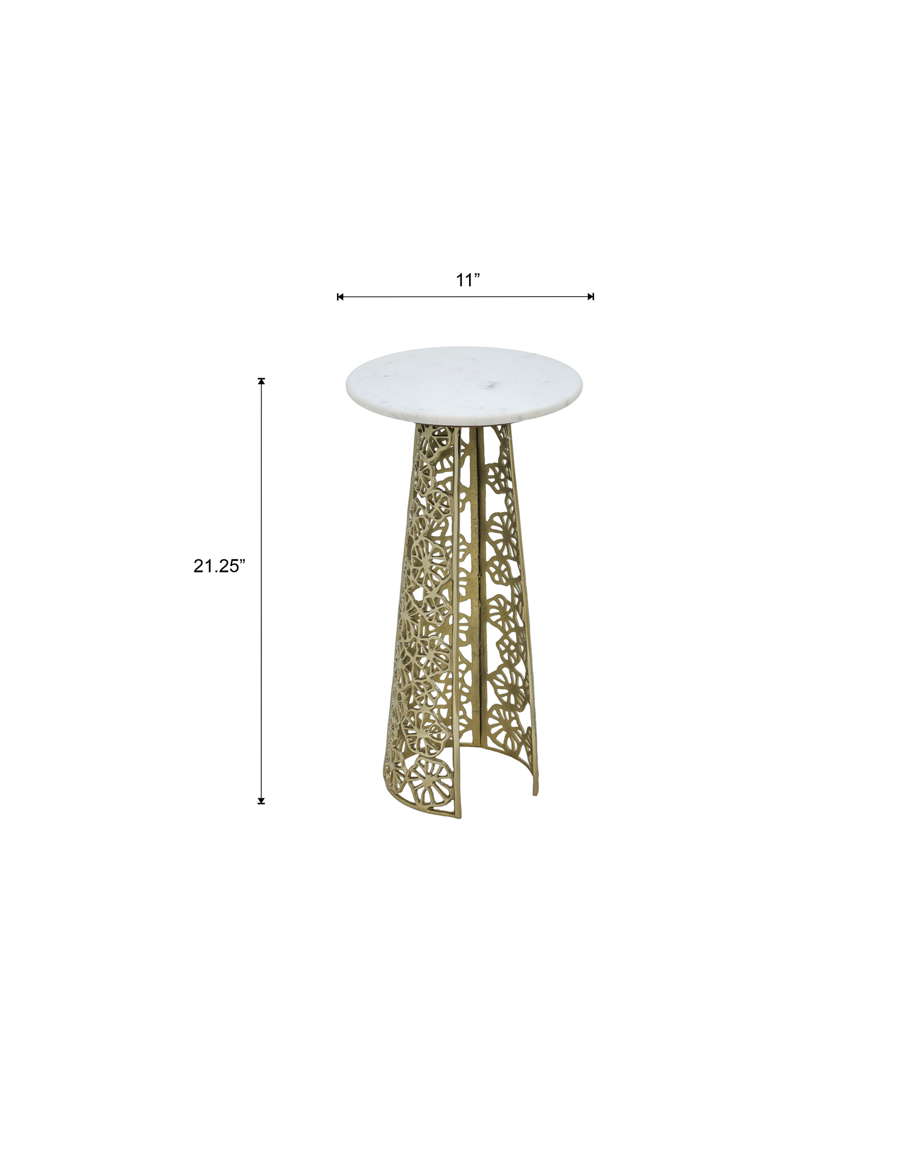 Design: Decorative, cut-out gold base with a round white marble top
