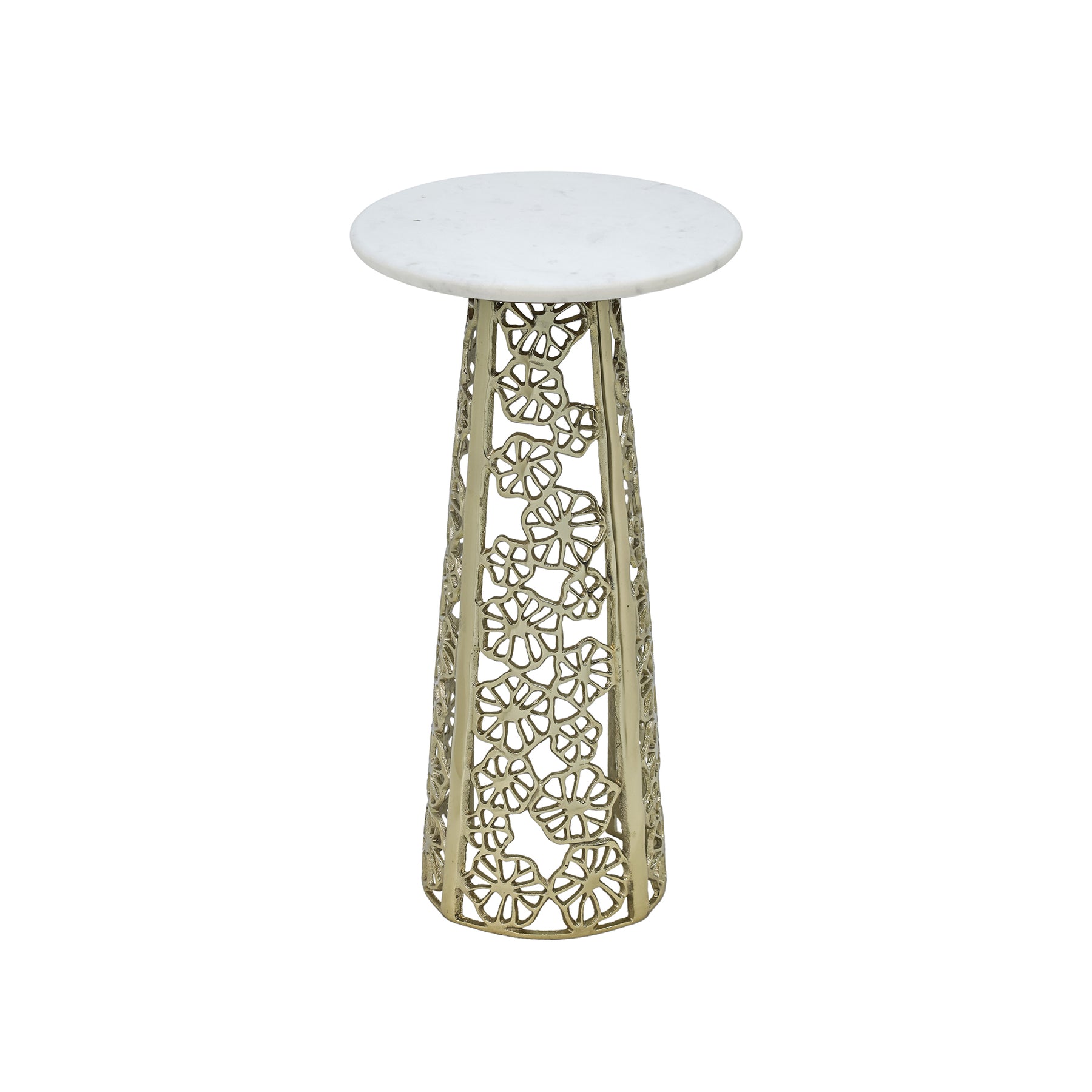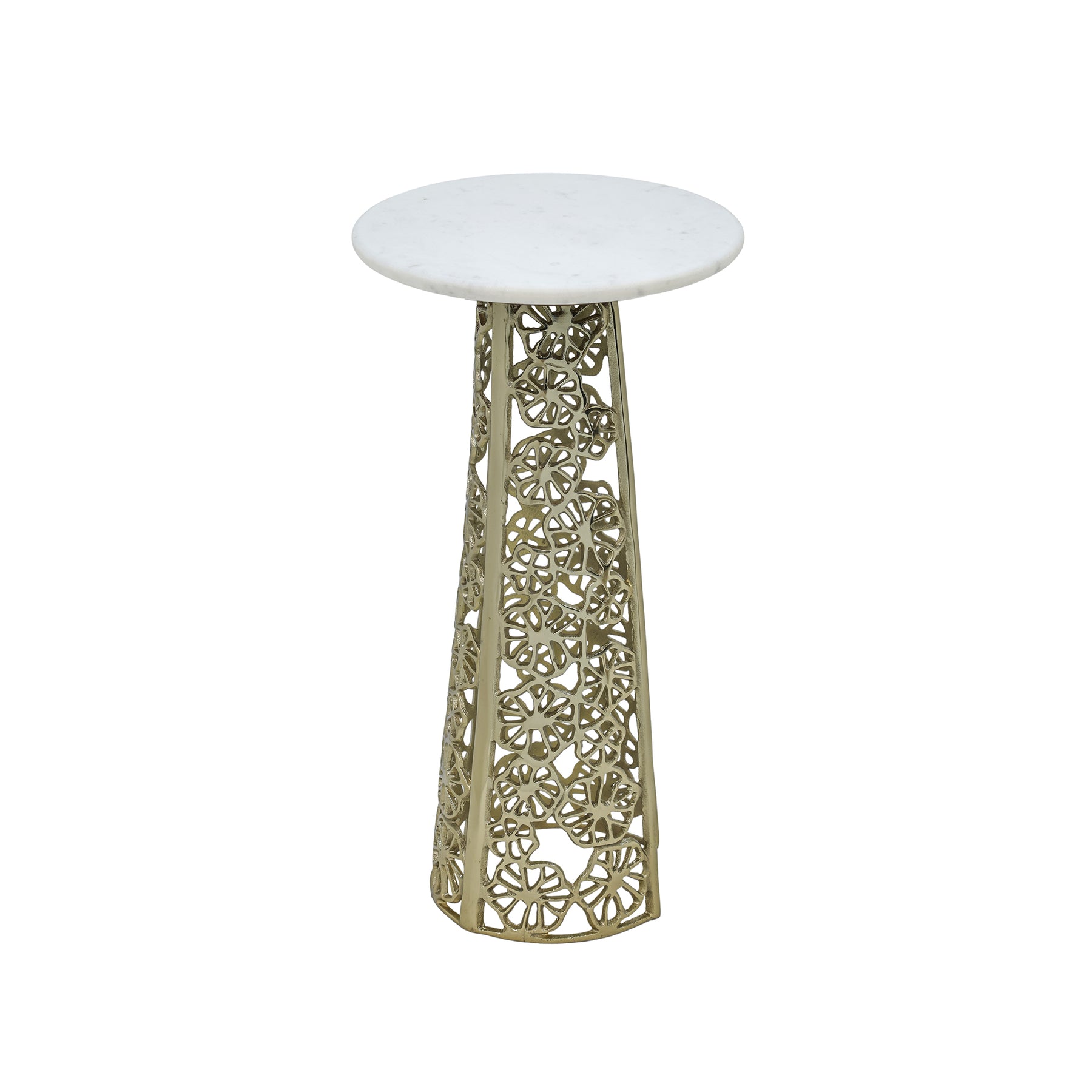 The Side Table with White Marble Top features a luxurious gold-finished Aluminum base with intricate cut-out.