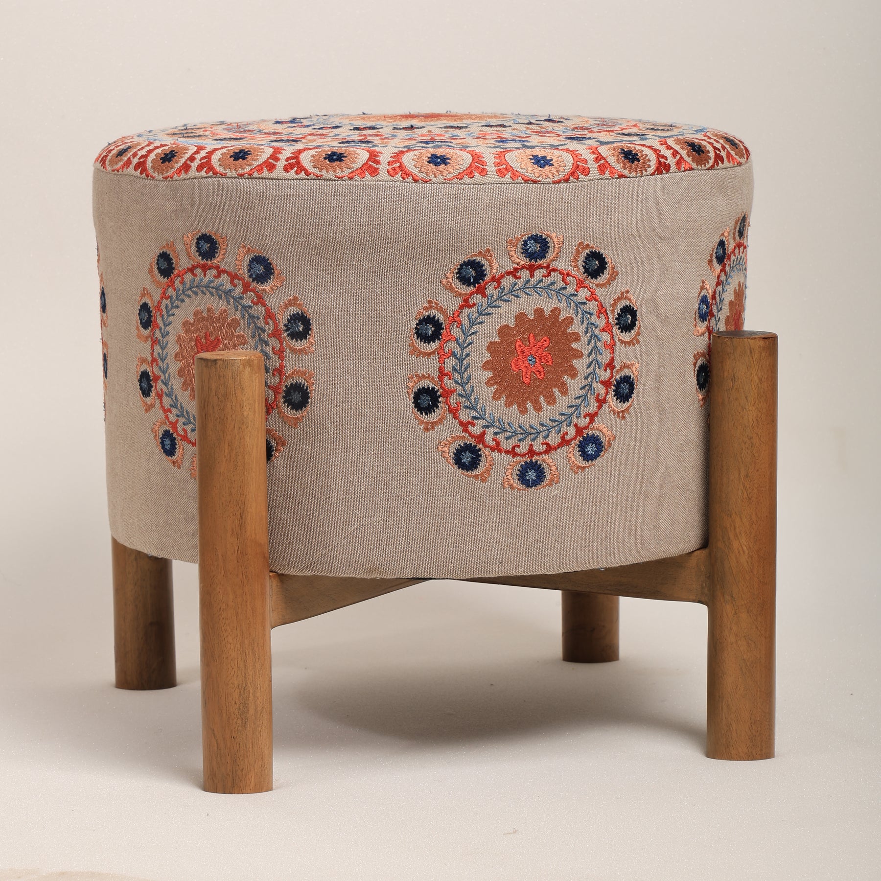 The Mandala Design Embroidered Stool is a beautifully crafted piece featuring intricate mandala embroidery on beige cotton fabric. The stool’s vibrant colors and geometric design are complemented by the natural wood legs, providing both style and functionality. This stool makes a great addition to any space, offering both a decorative accent and a comfortable seating option.