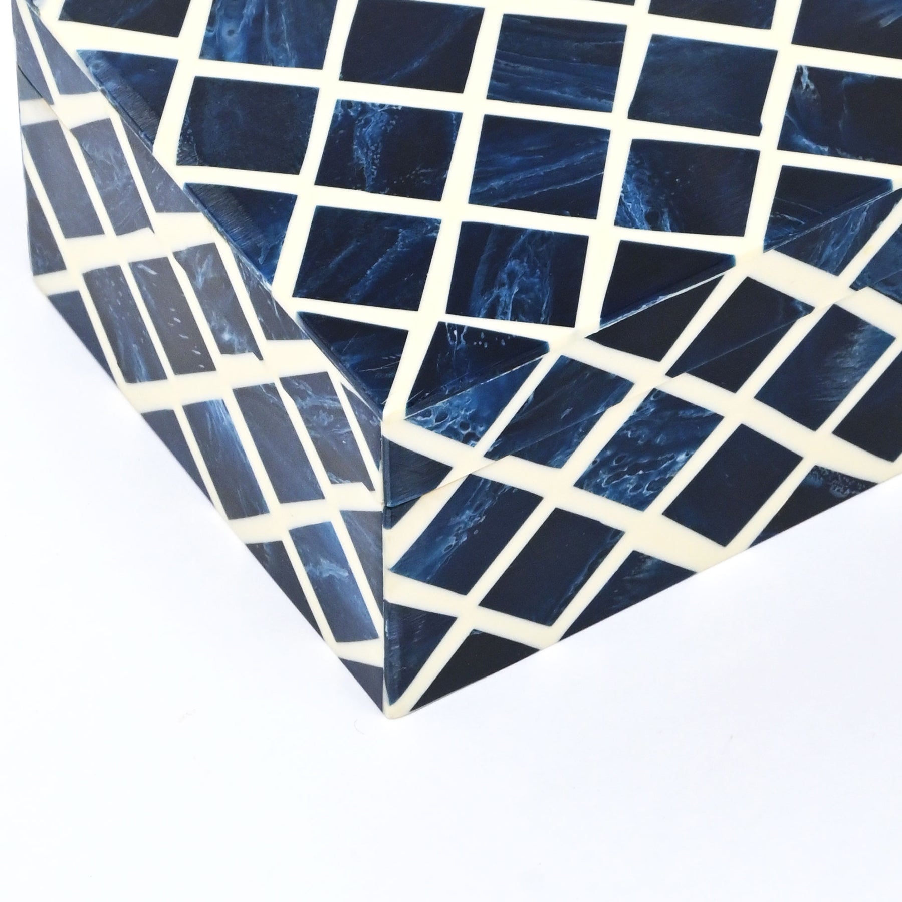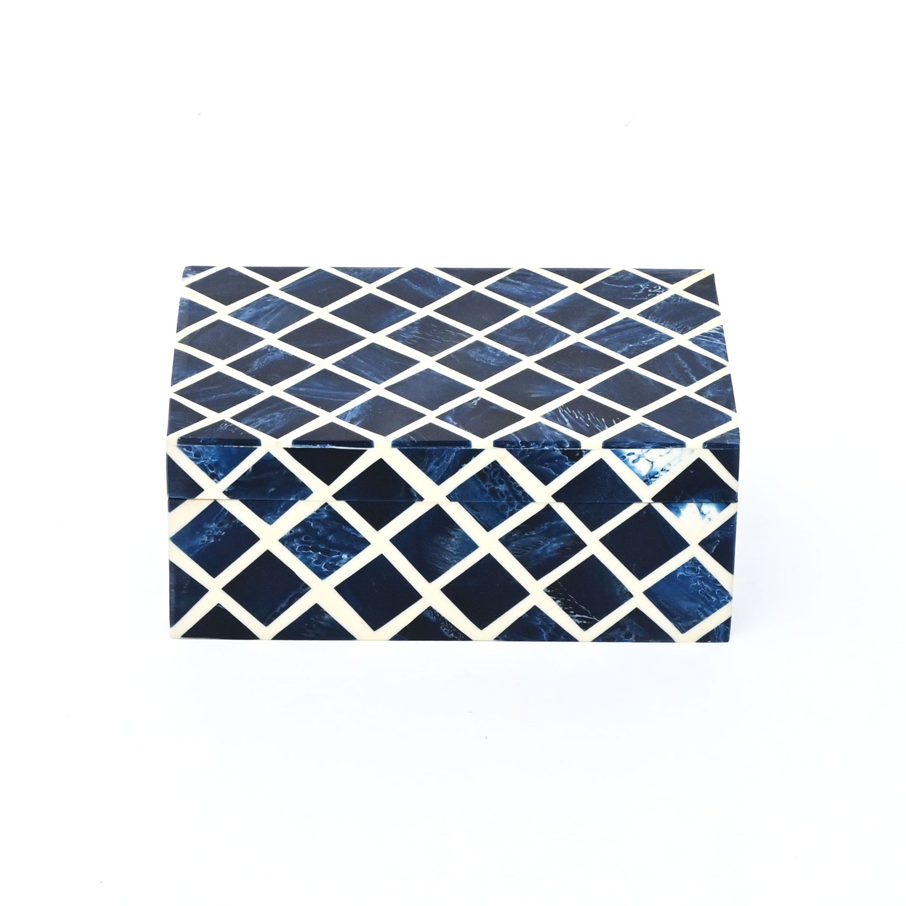 Inspired by bold geometric patterns, this blue resin diamond box features a striking lattice design that adds depth and visual intrigue. Set against a mango wood base with contrasting white and black tones, the glossy resin surface creates a refined, modern aesthetic. Perfect for storing small essentials or styling as a decorative accent, this box blends contemporary design with handcrafted appeal.
