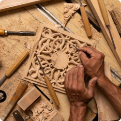 Skilled craftwork of creating unique designs on wood using sharp tools such as chisel, knives, skews, etc. to achieve elegant artisanal designs.
